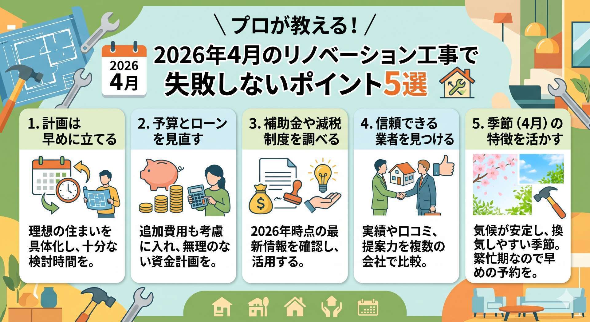 リノベーションは大きな投資であり、住まいに対する愛着を深める絶好の機会でもあります。失敗しないためには、情報収集と準備を怠らず、積極的に専門家の力を借りることが賢明です。この記事を参考に、2026年4月からの新しい時代のリノベーションを、安全で快適、そして経済的にも満足のいくものにしてください。